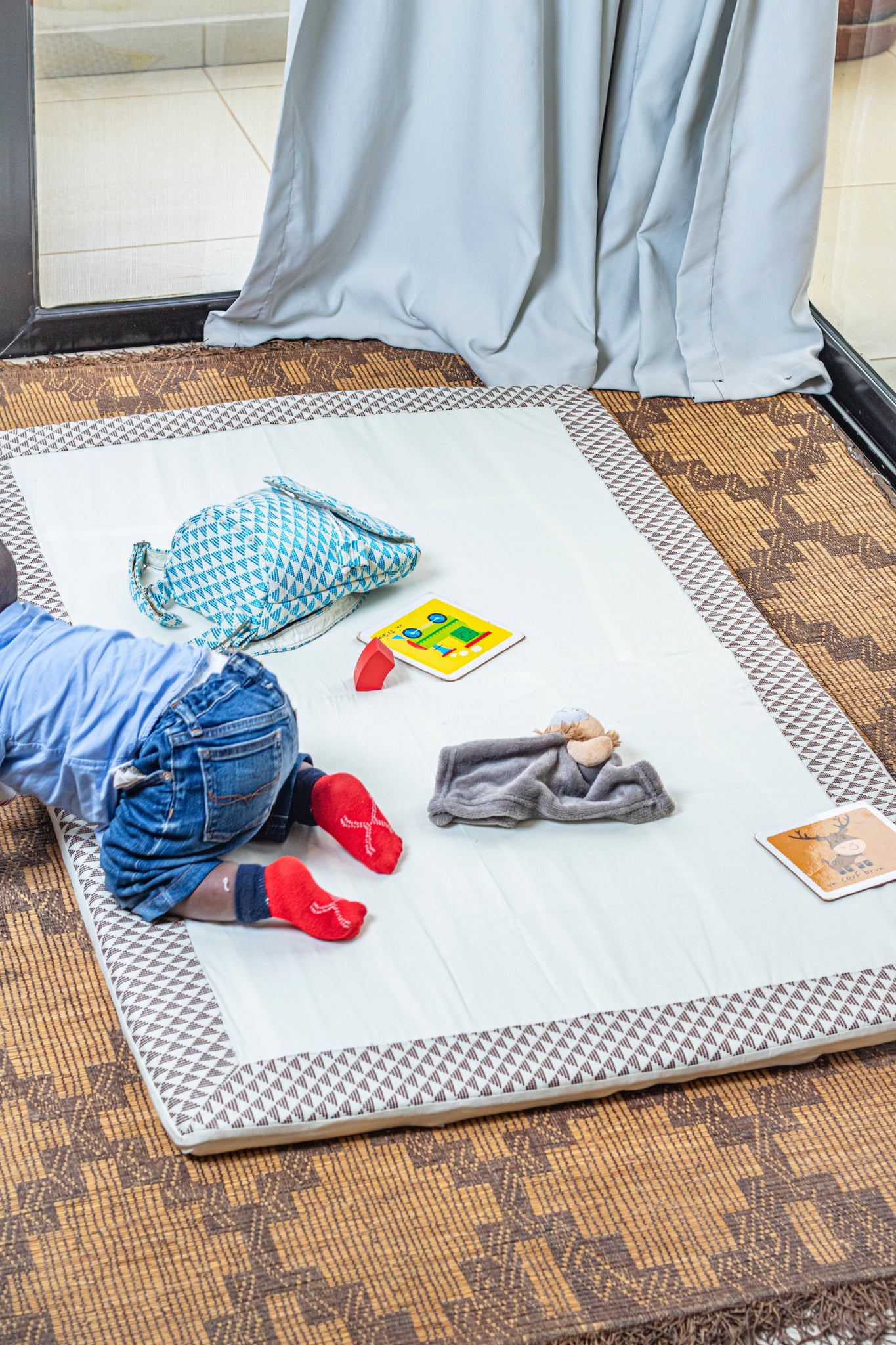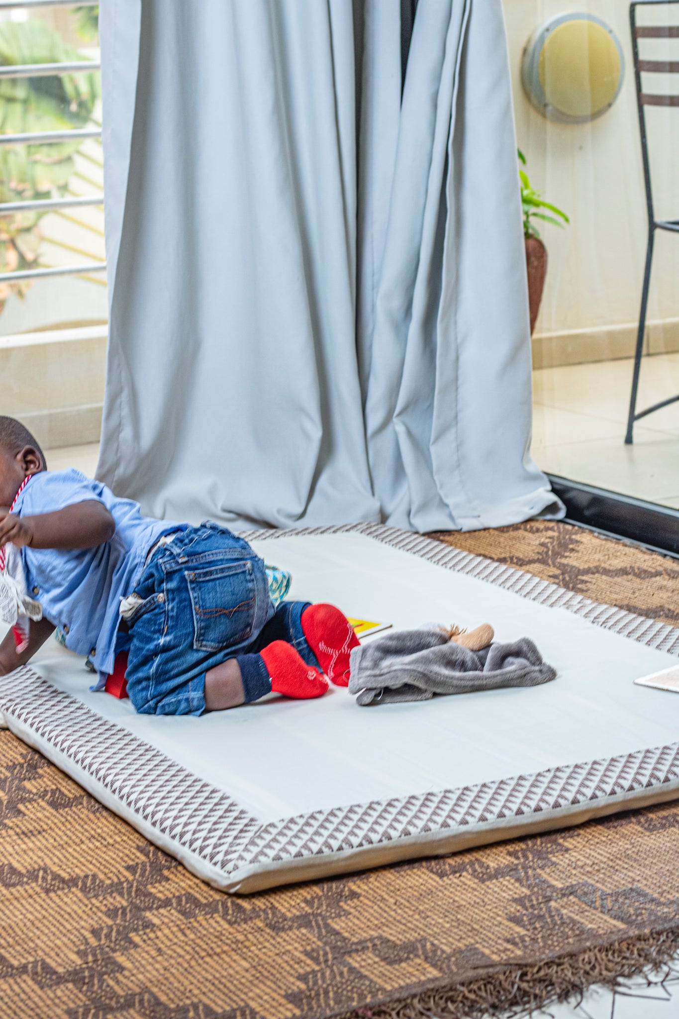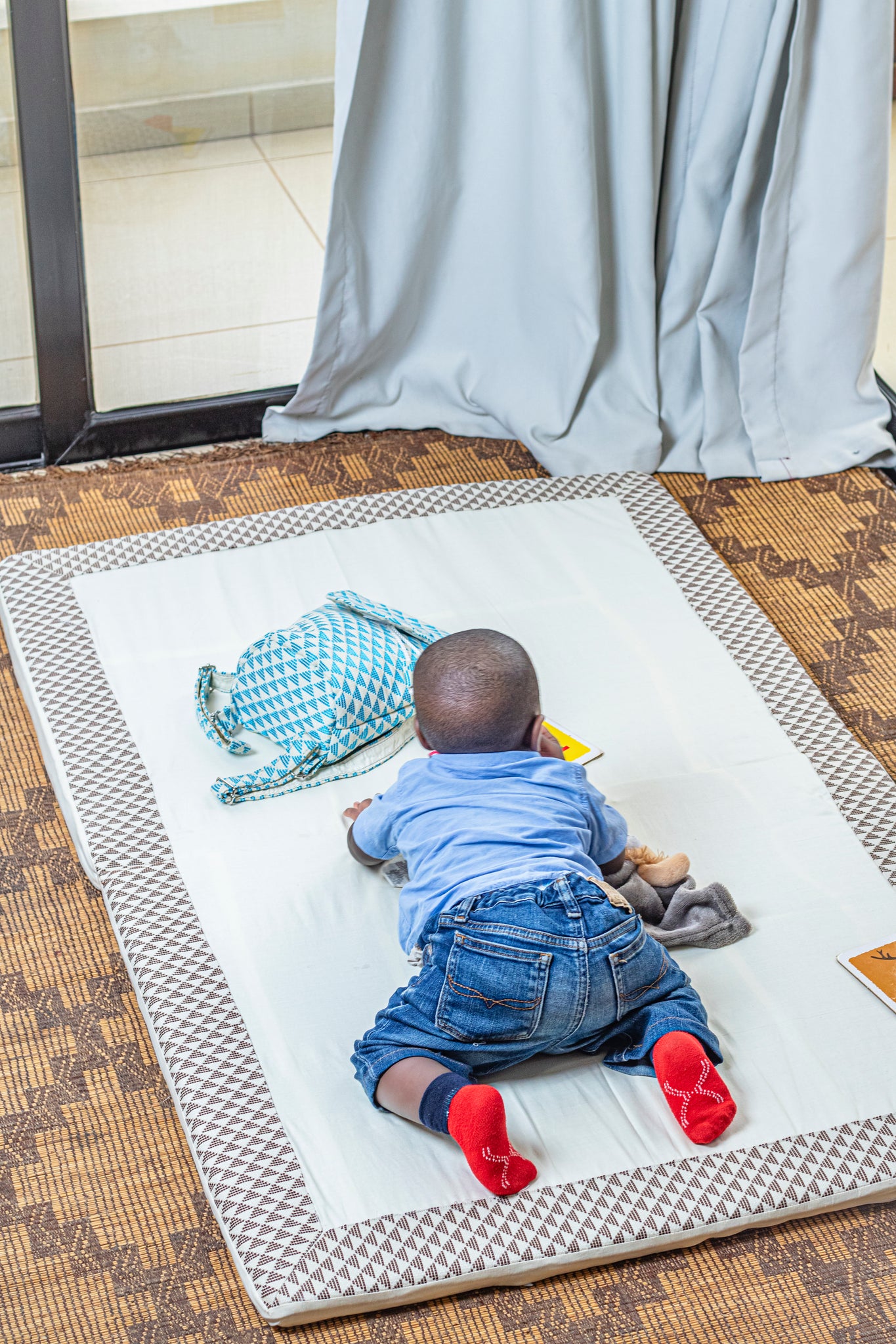 Offrez à votre bébé un espace unique d’exploration et de douceur grâce à notre tapis d’éveil en pagne tissé, fabriqué avec soin par des artisans locaux. Ce tapis associe le charme du pagne authentique à un rembourrage moelleux pour garantir confort et sécurité durant les premiers moments d’éveil.