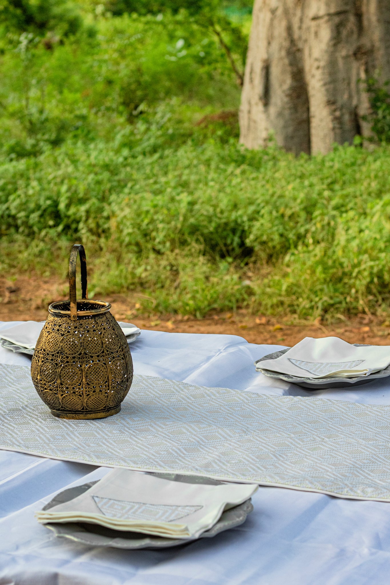 Ce chemin de table et ses 6 serviettes en pagne tissé invitent la chaleur de l’Afrique au cœur de vos repas.