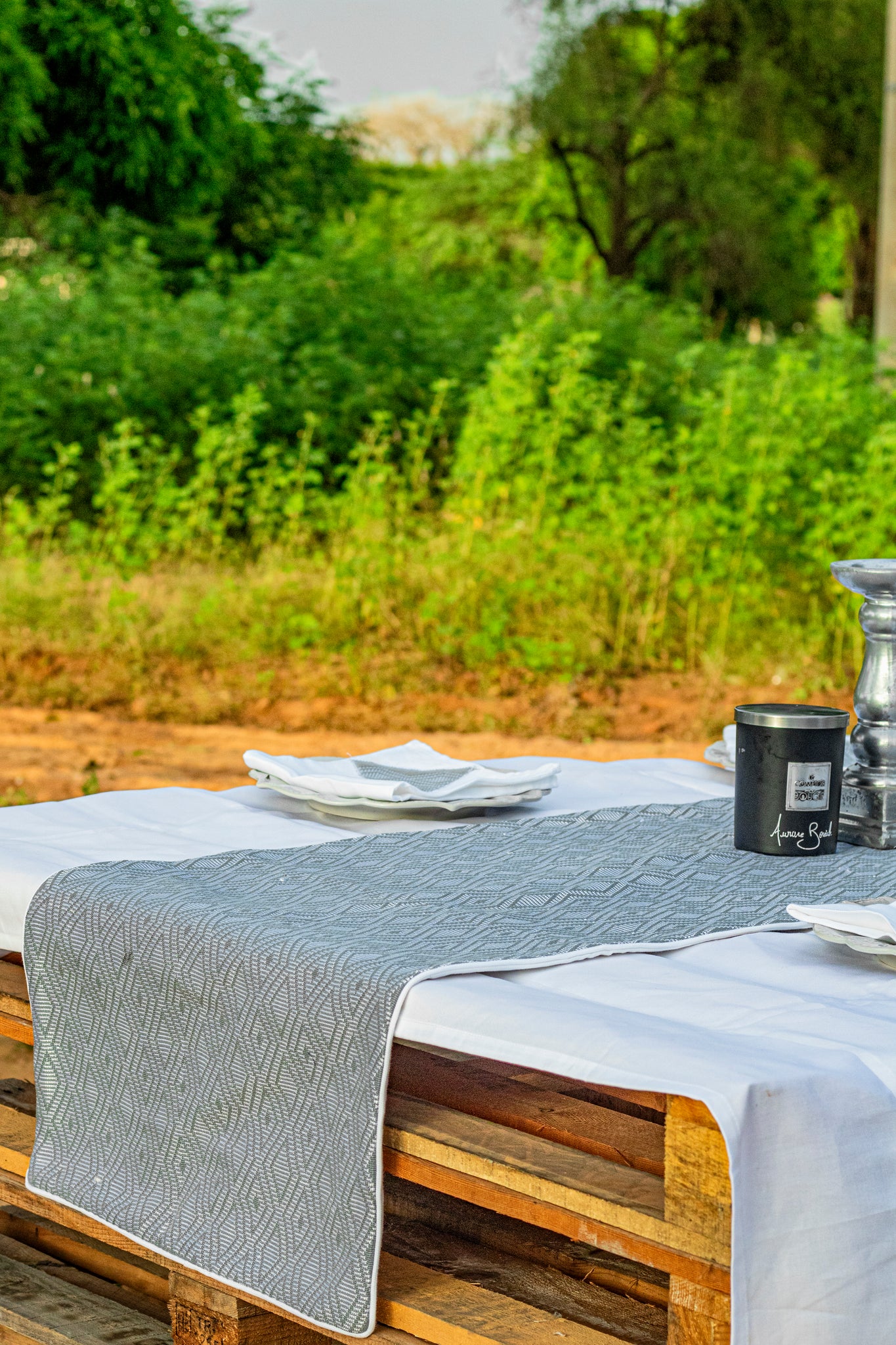 Transformez vos repas en véritables instants de convivialité grâce à ce chemin de table et ses 6 serviettes en pagne tissé.