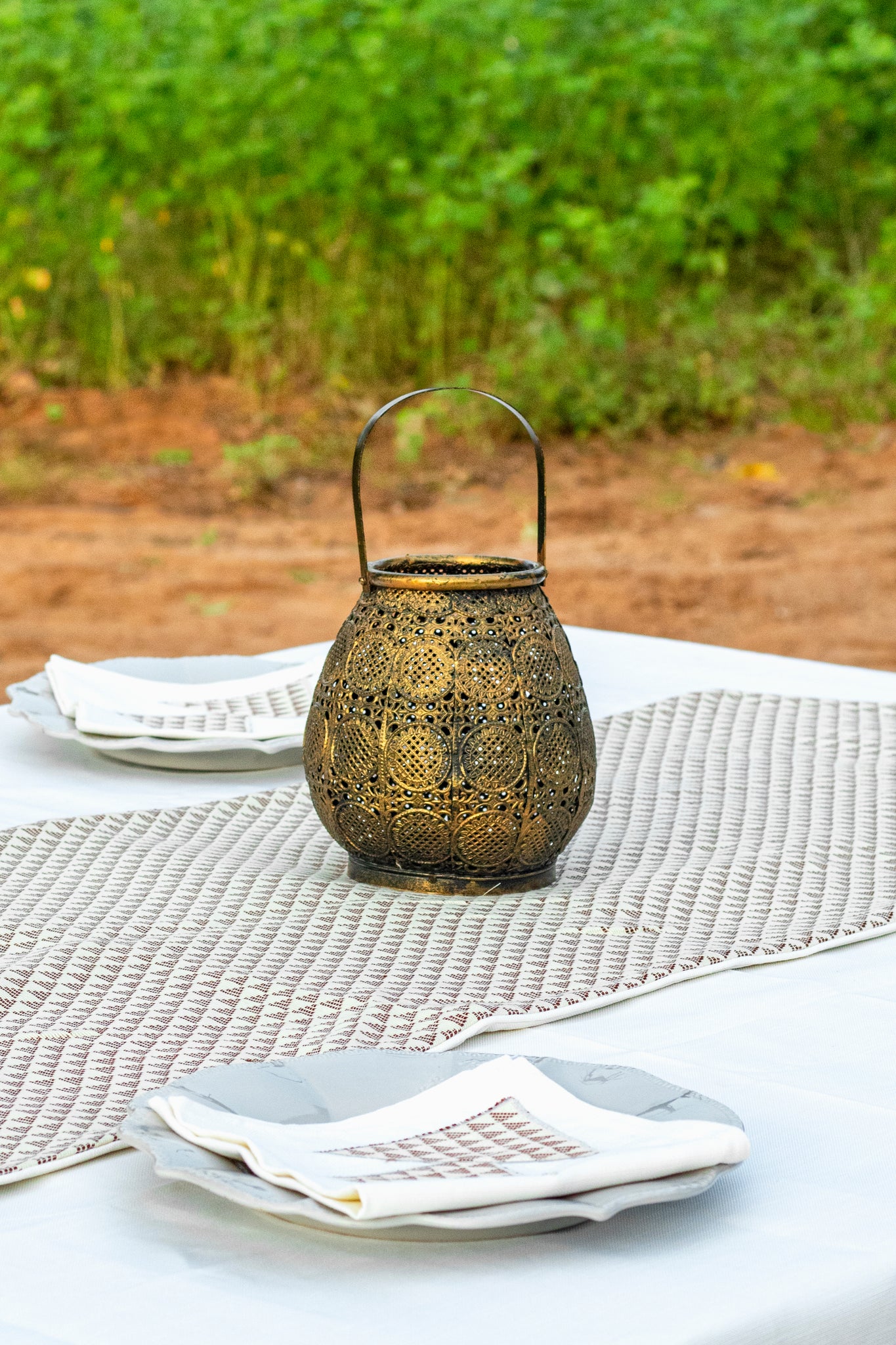 Ce chemin de table accompagné de 6 serviettes est confectionné en pagne tissé, alliant tradition et élégance.