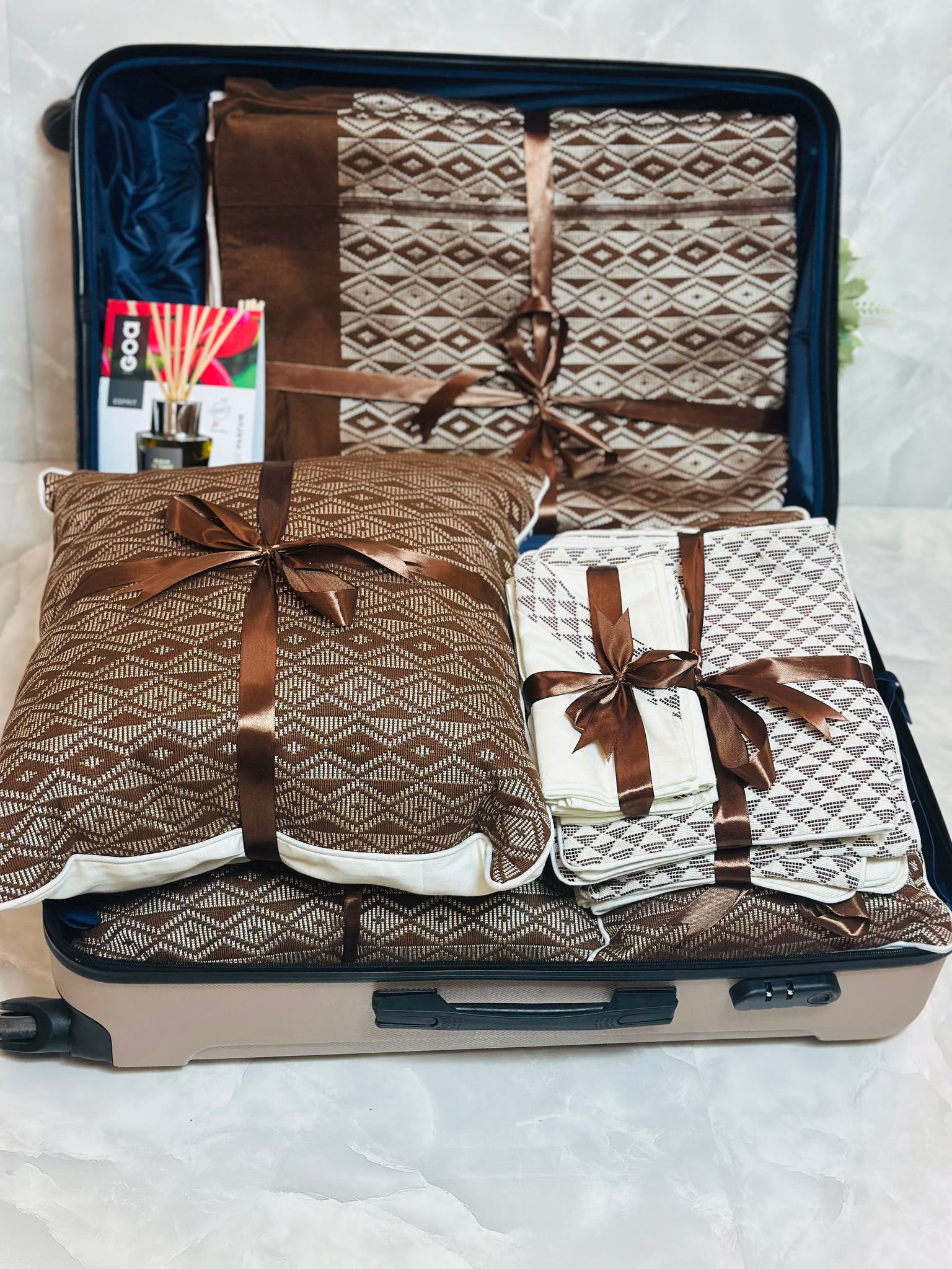 Valise décorée composée de 1 parure de lit en pagne tissé + 1 ensemble nappe , sets de table et serviettes de table en coton et pagne tissé + 1 diffuseur de parfum d’intérieur